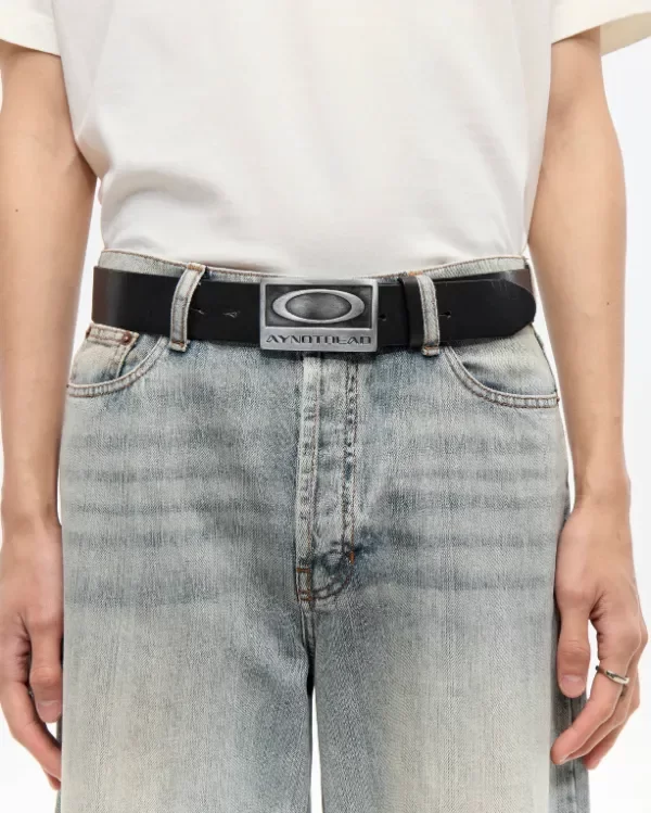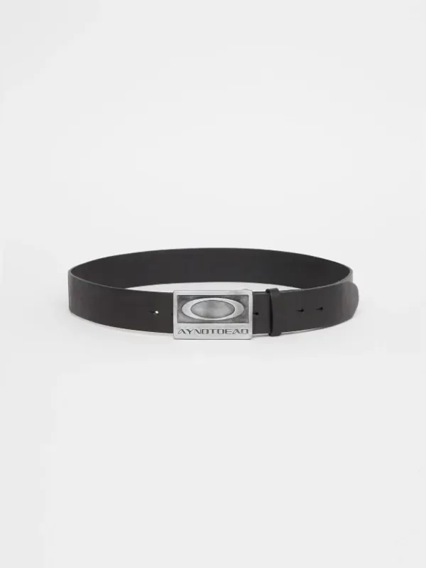 Cinturón de cuero vacuno negro liso, de 4,5 cm de ancho, posee hebilla Ay not dead personalizada, metálica color plata gastado y con forma rectangular. Lleva 8 orificios para regular su largo.