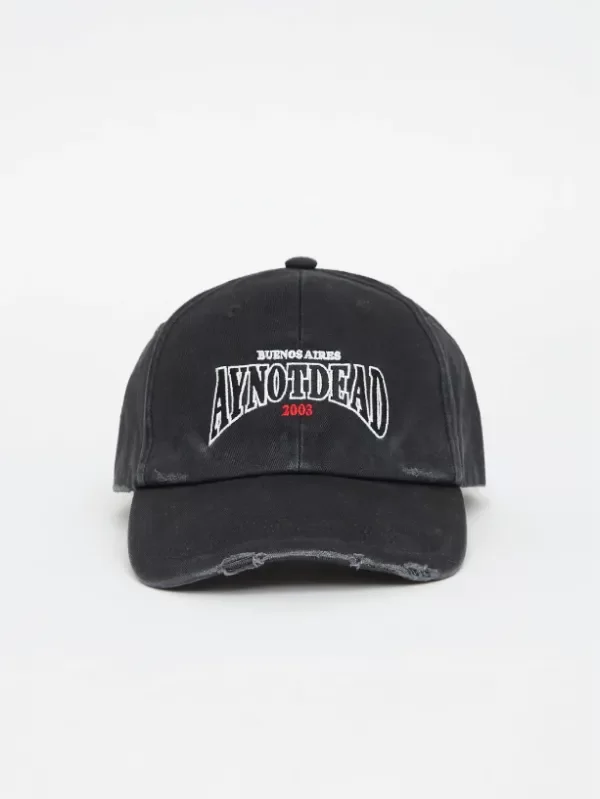 Gorra clásica de gabardina efecto gastado con roturas y hebilla metálica para regular. Lleva logo Ay not dead College bordado a contratono en el delantero y ojales de ventilación a tono en parte superior.