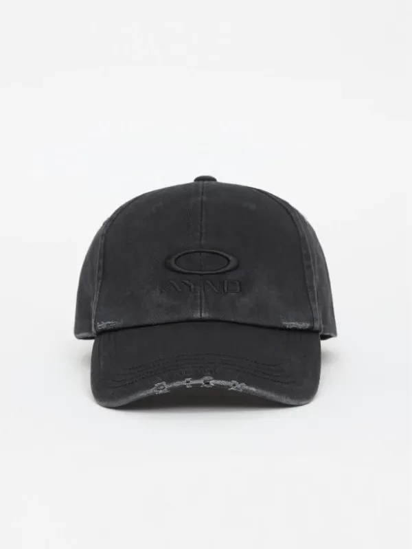 Gorra clásica de gabardina efecto gastado con roturas y hebilla metálica para regular. Lleva logotipo bordado en el delantero, logo Ay not dead en visera y ojales de ventilación a tono en parte superior.