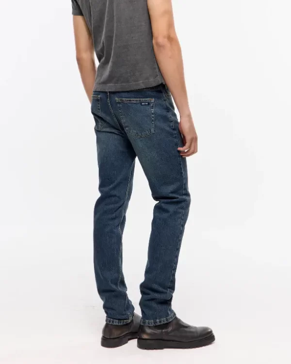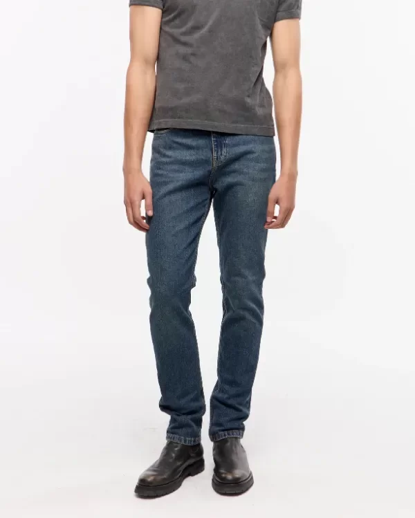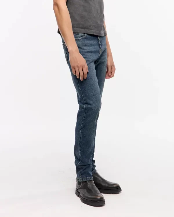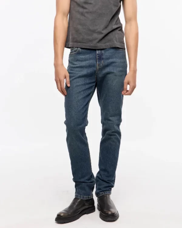 Jean 5 bolsillos, tejido egipcio de algodón con lycra, lavado azul medio oscuro, con matizado verdoso y bigotes, lo que le da un look mas vintage y usado al pantalón.