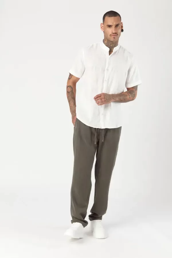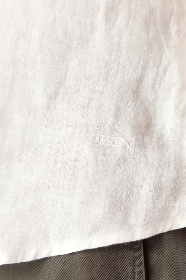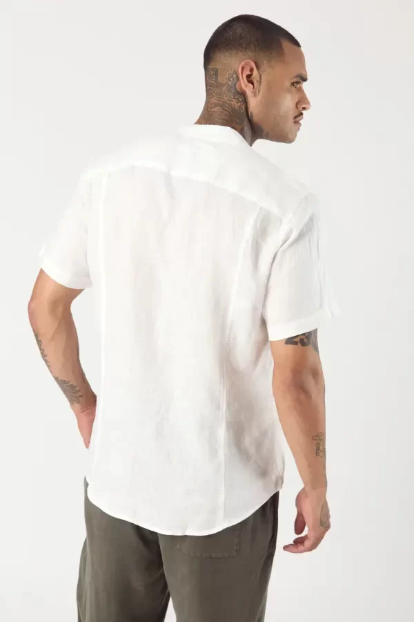 Camisa de calce slim fit confeccionada con 100% lino. Cuello mao y detalle de comunicación de bordado a tono en canesu de espalda.
