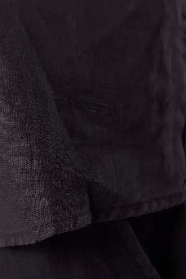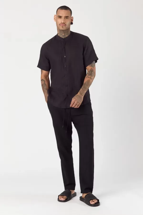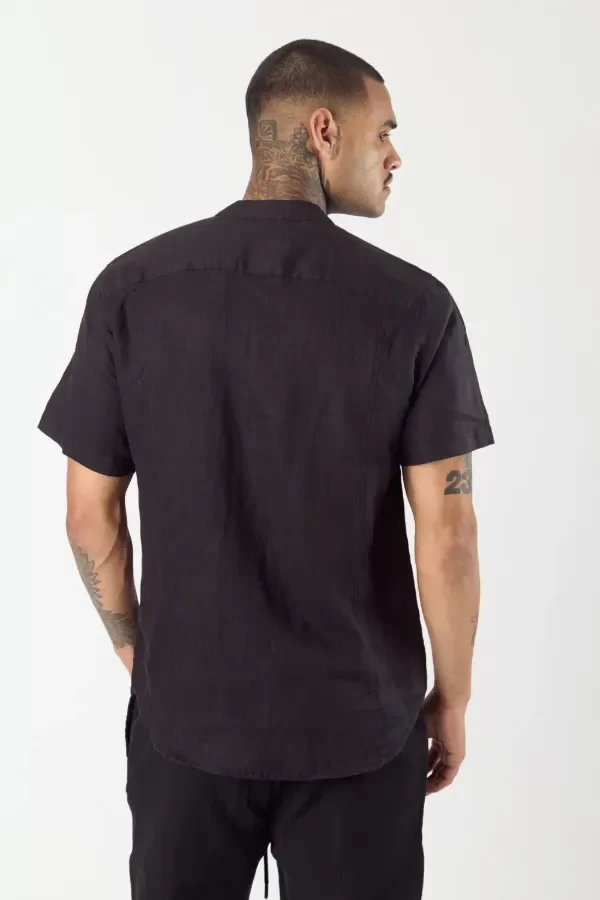 Camisa de calce slim fit confeccionada con 100% lino. Cuello mao y detalle de comunicación de bordado a tono en canesu de espalda.