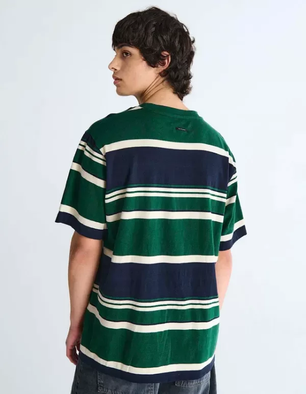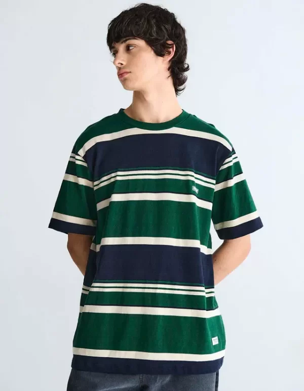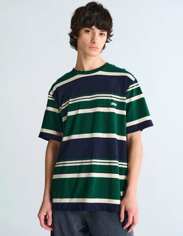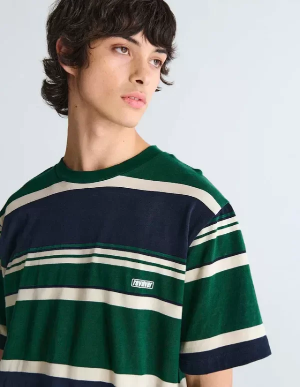 Remera rayada m/c con cuello redondo a contratono de calce regular en jersey. Diseño exclusivo de raya y bordado frontal personalizado.