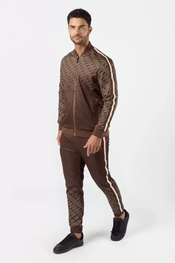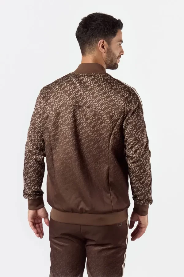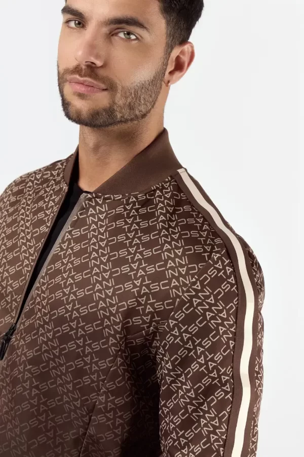 Buzo tipo camperita deportiva de calce fit. Confeccionado en tela deportiva full print con logo Tascani en degrade en colores tierra. Acceso frontal mediante cierre central y bolsillos laterales con cierre y punteras personalizadas a tono. Detalle de tira en la gama de colores con el centro estampado en silicona.