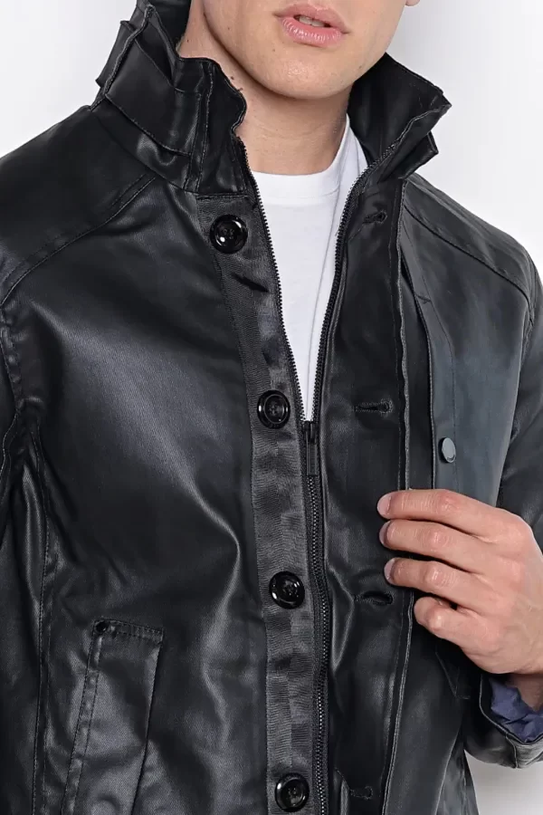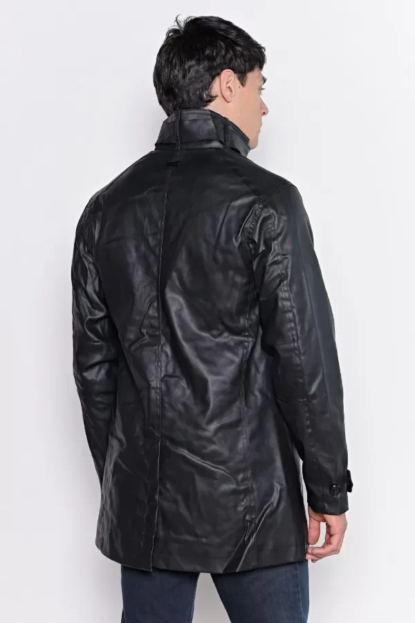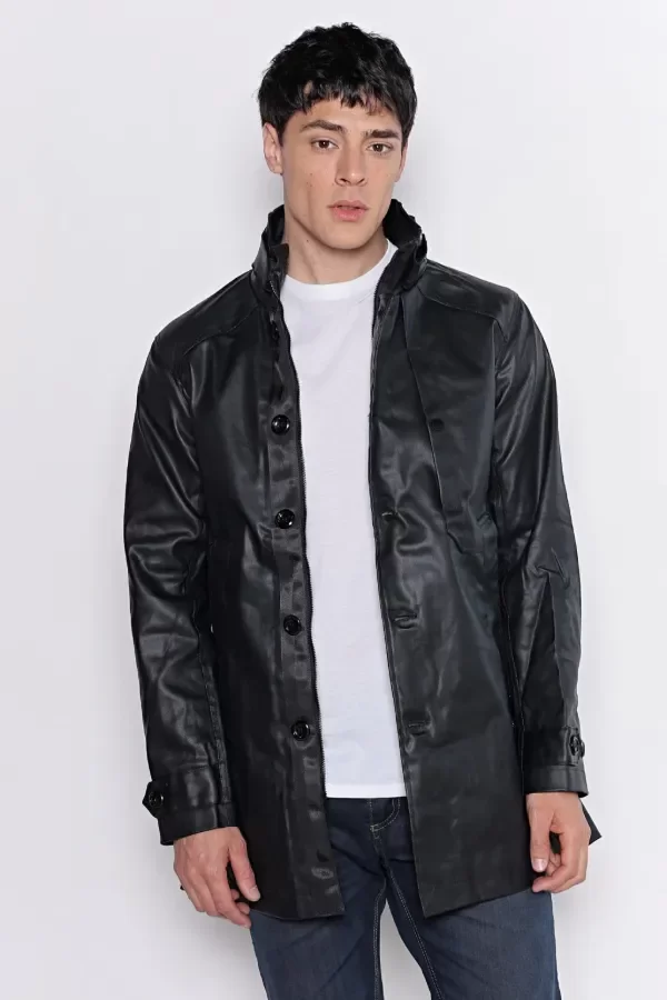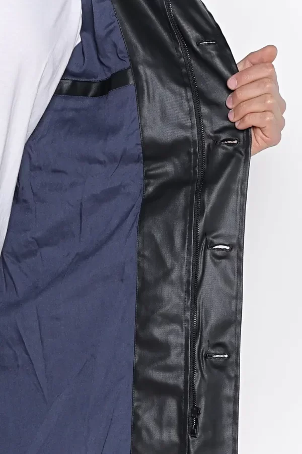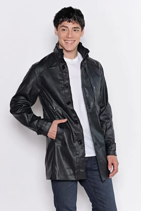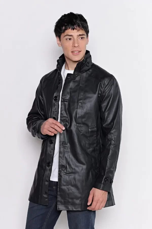 Campera larga confeccionada en tela resinada, con acceso mediante cierre metálico negro y cartera con botones que refuerzan su diseño. Presenta dos bolsillos laterales y un bolsillo en el pecho aportando funcionalidad. Su interior está forrado en poplín azul noche. Una prenda de estética moderna, pensada para acompañar looks urbanos con presencia.