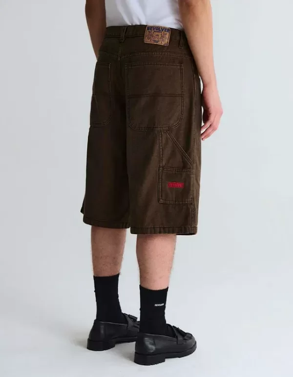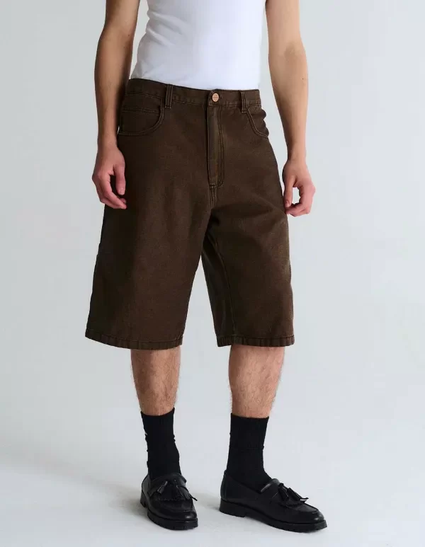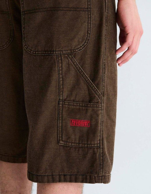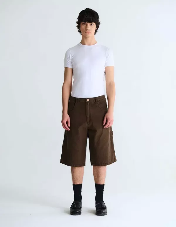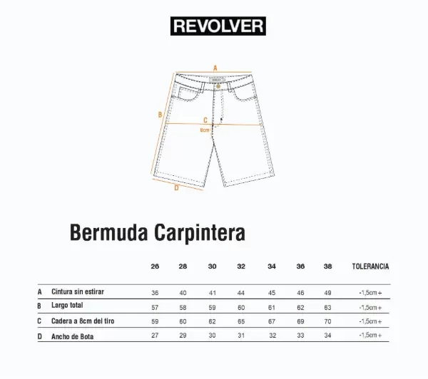Bermuda carpintera de denim con botones y remaches metálicos, badana JL, bordado personalizado. Lavado desgaste parejo.