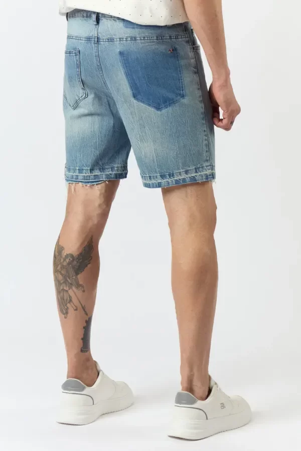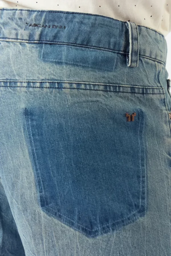 Bermuda de jean de piernas recta y calce cómodo, bajada de color a celeste con acid wash, manteniendo un azul en laterales. Bolsillo trasero derecho y badana marcado solo por contorno del faltante de pieza y reserva de color mas intensa, en esta ubicación Tascani bordado.
