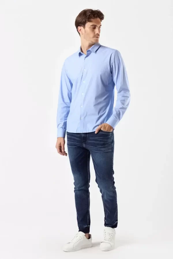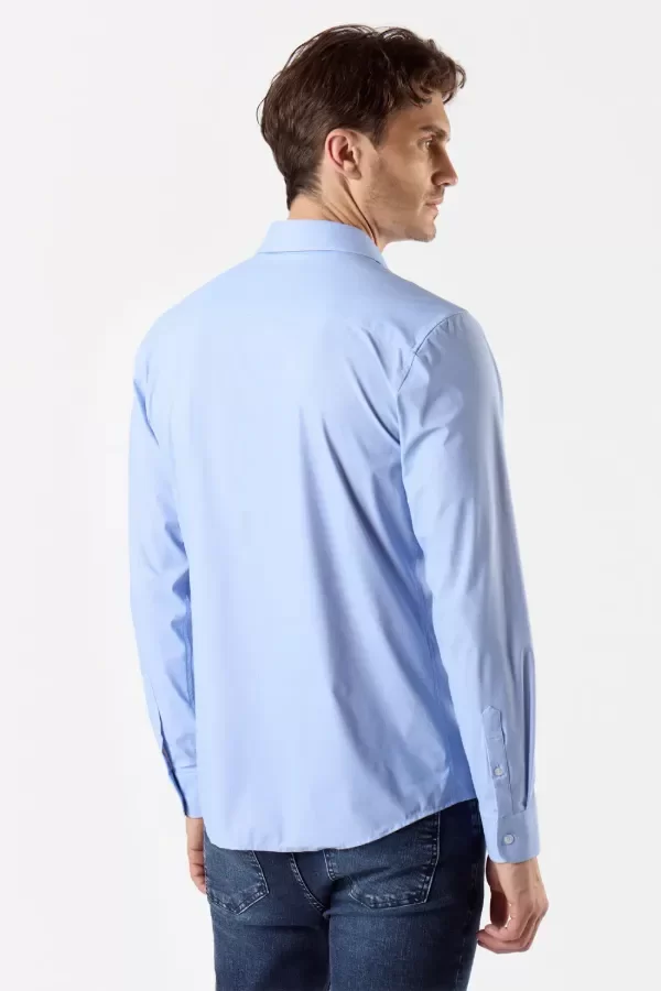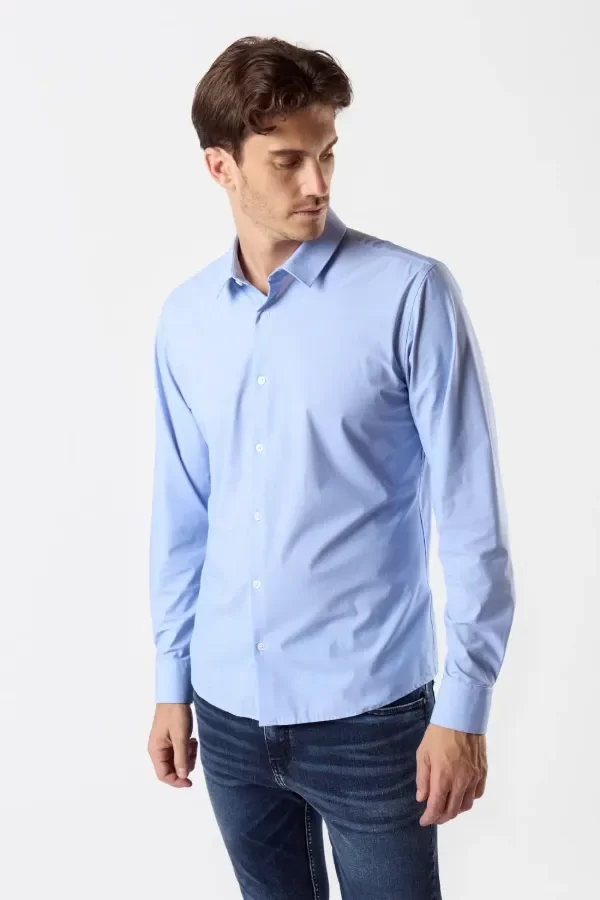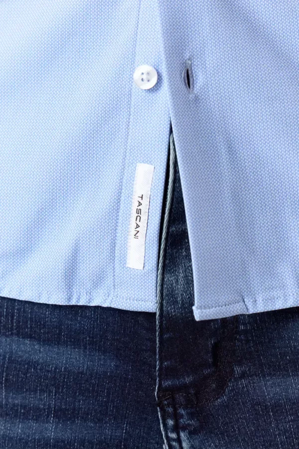 Camisa slim fit confeccionada en lycra de seda estampada con puntitos color celeste. Este tejido stretch presenta una gran elasticidad y confort. Detalle de grifa textil en interior de cartera de acceso. Cuello americano.