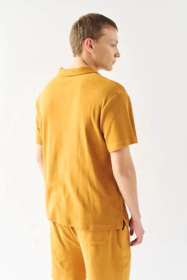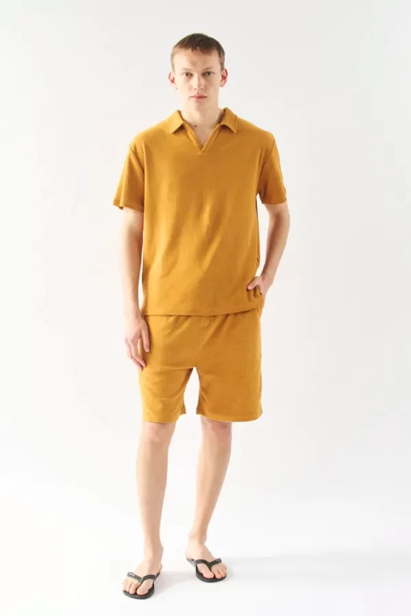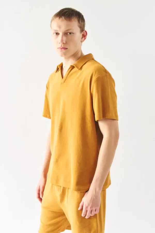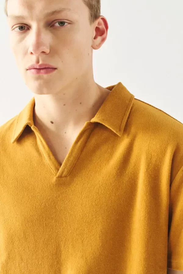 Chomba escote V manga corta con tajos laterales. Calce regular. Tejido towel.