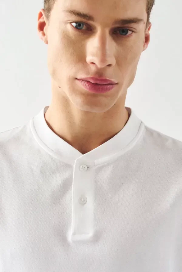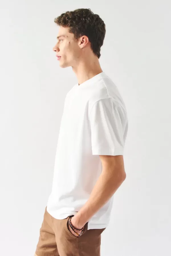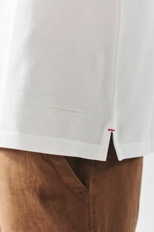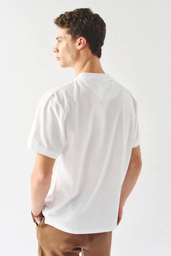 Remera manga corta de calce regular confeccionada en Lino 100%. Con cuello de ribb, costura lateral en cadena y tajos.