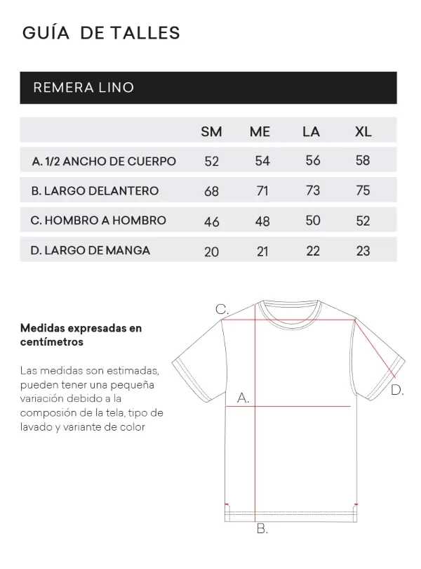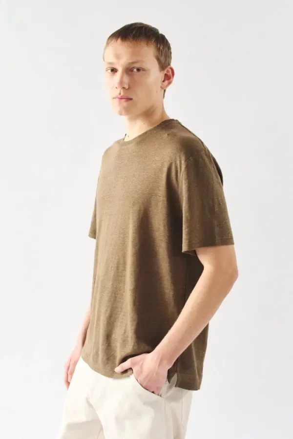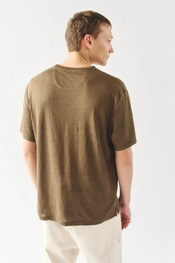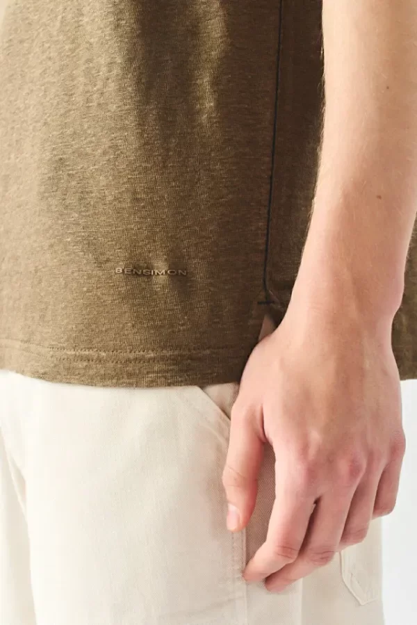 Remera manga corta de calce regular confeccionada en Lino 100%. Con cuello de ribb, costura lateral en cadena y tajos.