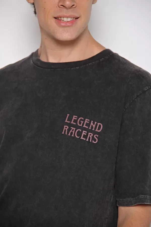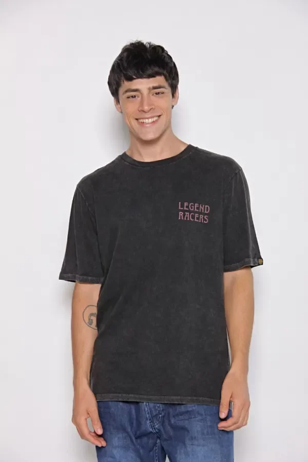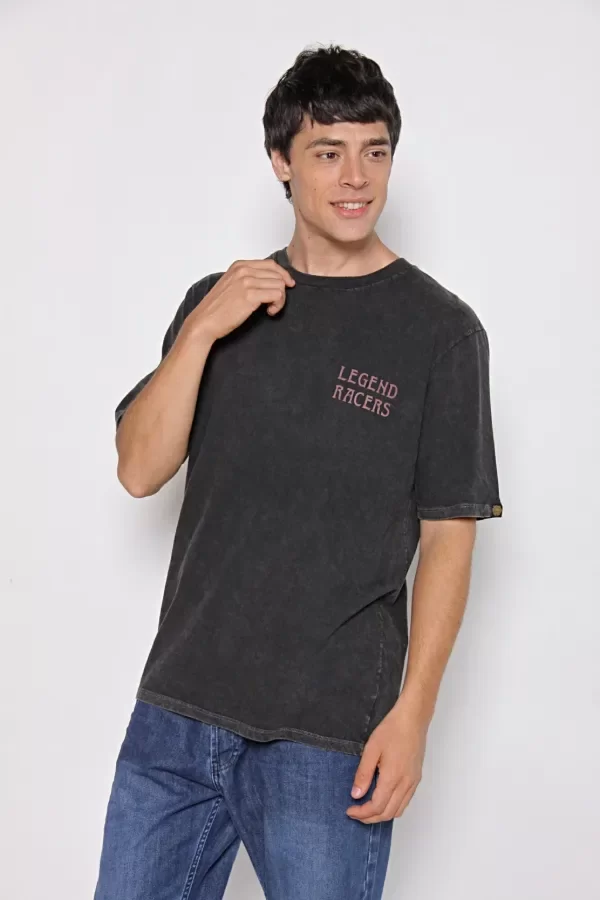 Remera oversize estampada de escote redondo y mangas cortas, confeccionada en jersey de puro algodón. Presenta cuello en ribb al tono que acompaña al diseño. La prenda lleva un proceso de teñido artesanal que genera un aspecto levemente gastado con efectos localizados, aportando un carácter y un look distintivo. Incorpora una estampa de logo en el frente y una estampa central en la espalda, ambas sin tacto, que suman identidad sin alterar la suavidad del tejido. Su calce holgado brinda comodidad y refuerza su estilo urbano para el uso diario.