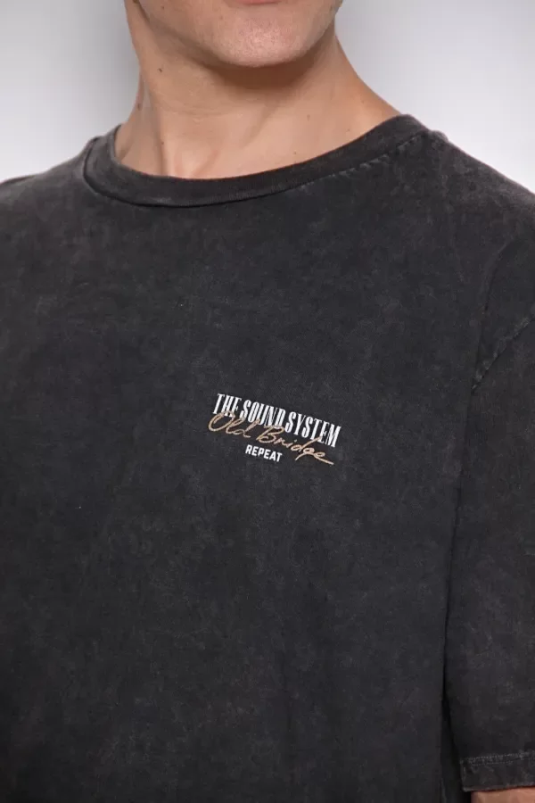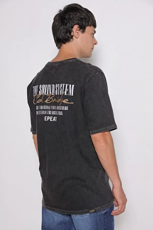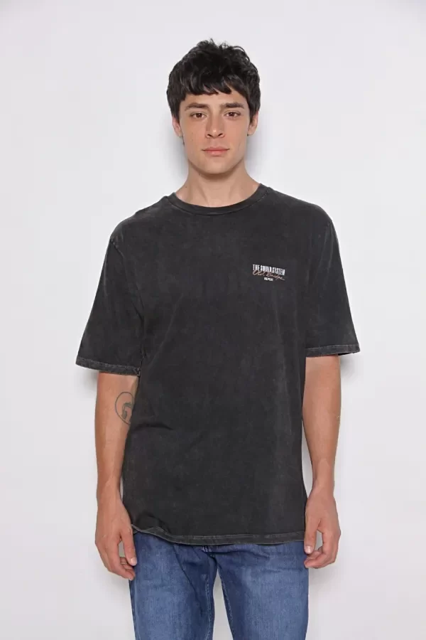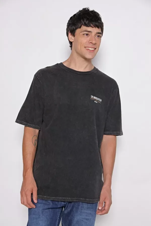 Remera oversize estampada de escote redondo y mangas cortas, confeccionada en jersey de puro algodón. Presenta cuello en ribb al tono que acompaña el diseño. La prenda cuenta con un proceso de teñido artesanal que genera un efecto visual veteado e irregular, aportando carácter y un aspecto distintivo. Incorpora una estampa de logo en el frente y una estampa central en la espalda, ambas sin tacto. Su calce holgado brinda comodidad y refuerza un estilo urbano relajado, ideal para el uso diario.