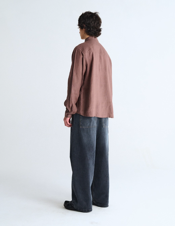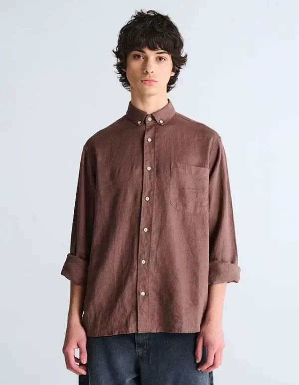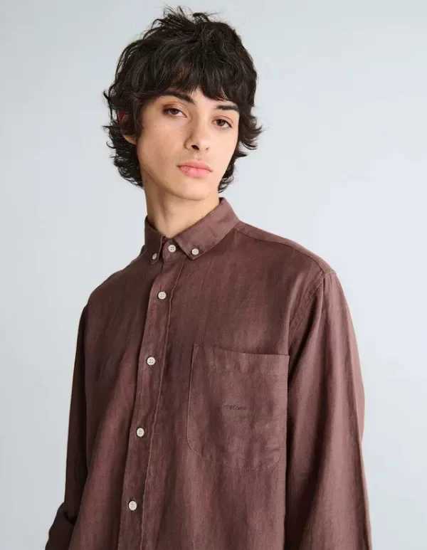 Camisa m/l de Puro Lino. Botones de pasta con logo y bolsillo delantero. Bordado personalizado frontal en bolsillo.