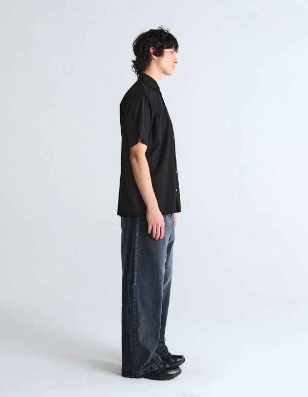Camisa m/l de gabardina teñida con botones de pasta personalizados y doble bolsillo delantero. Lavado desgaste parejo.