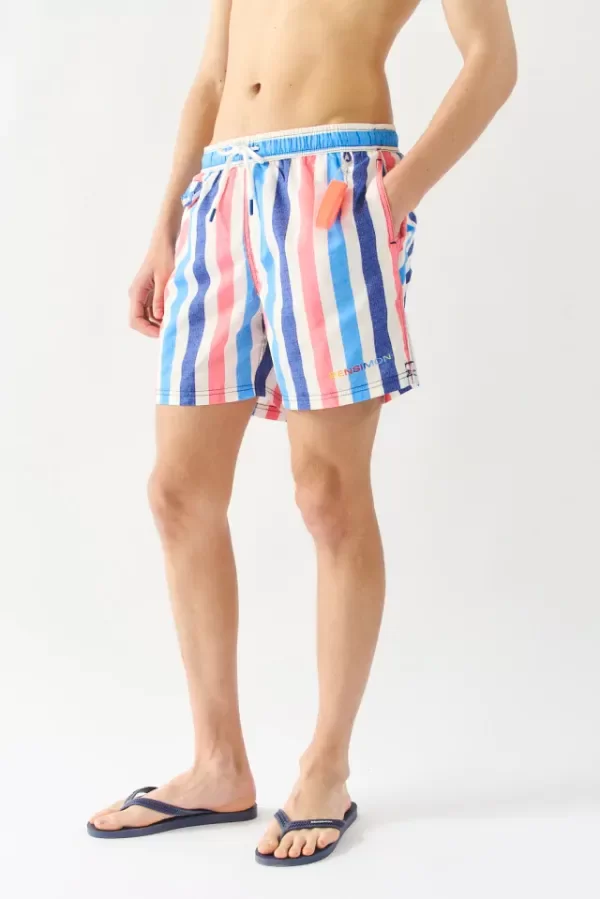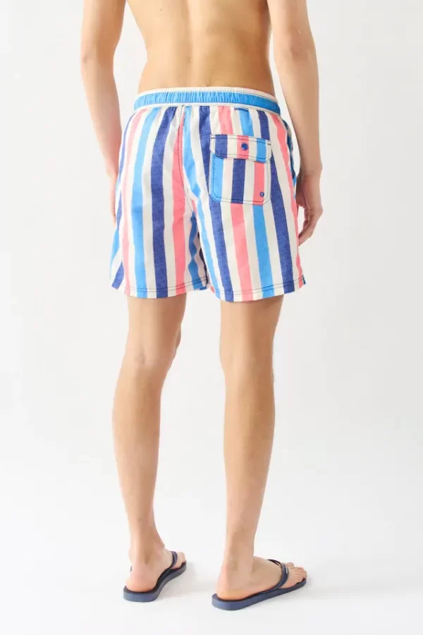 Short de baño rayado con cintura elastica regulable con cordón. Bolsillos laterales y bolsillo con tapa y broche en espalda. Suspensor interno. Logo bensimon en delantero. Posee bolsa de guardado.