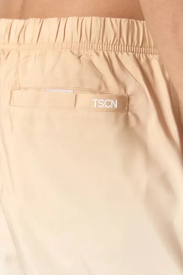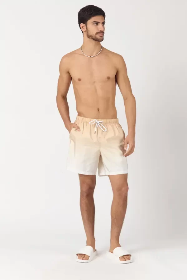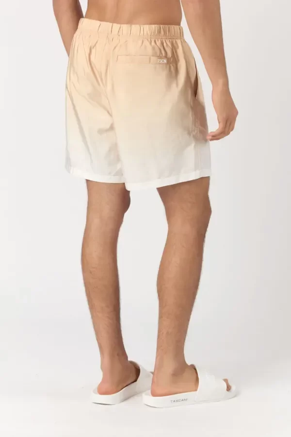 Traje de baño en degrade de camel a blanco. Cintura interior estampada, cordón estampado con textos tascani y punteras metálicas grabadas. Grifa de marca en lateral izquierdo e interior con suspensor a tono.