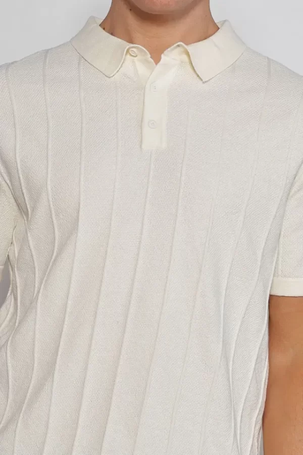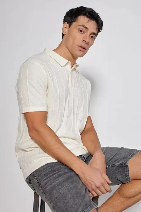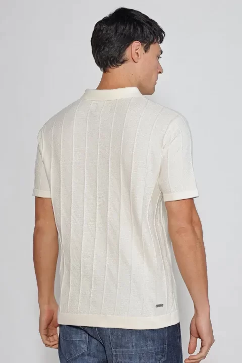 Chomba tejida lisa con un punto diferenciado vertical de algodón, tiene cartera con botones y manga corta. Los puños, cuello y cintura están tejidos al tono. Su calce es regular.