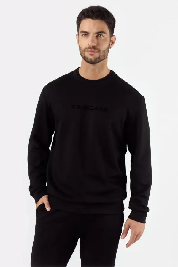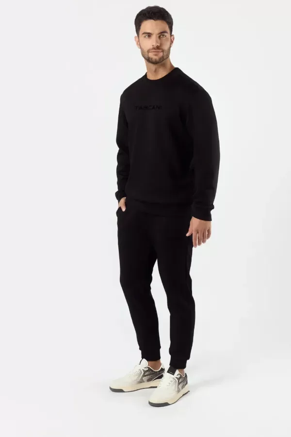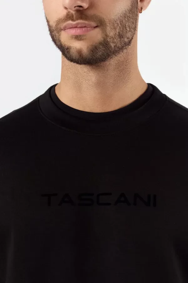 Buzo de calce regular, confeccionado en tela técnica de tacto muy suave en color negro. Comunicación de marca con estampa de logo "Tascani" centrado en delantero, en técnica flock (afelpado) a tono. Detalle de avio marcario con logo institucional en lateral inferior derecho de espalda a tono.