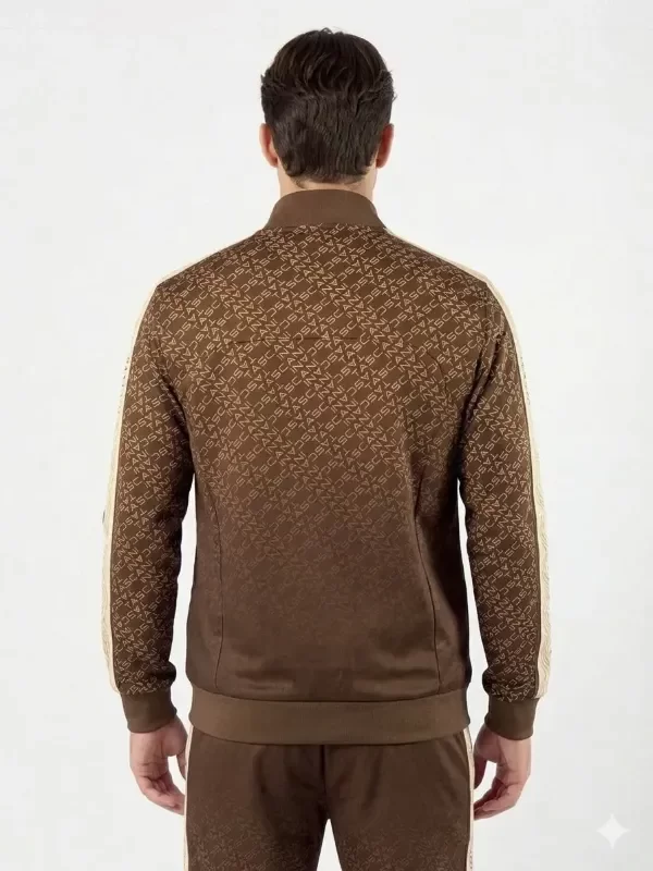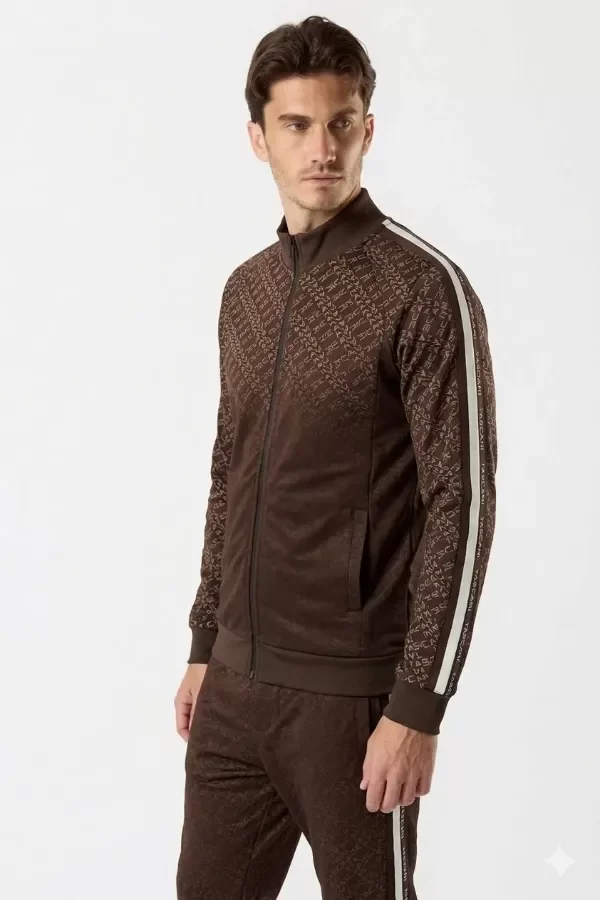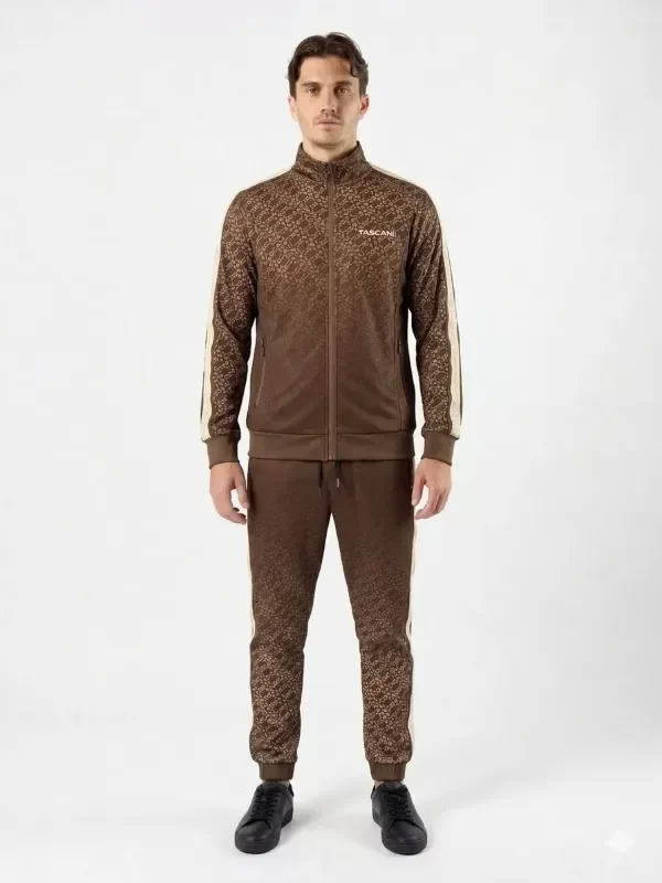 Buzo tipo camperita deportiva de calce fit. Confeccionado en tela deportiva full print con logo Tascani en degrade en colores tierra. Acceso frontal mediante cierre central y bolsillos laterales con cierre y punteras personalizadas a tono. Detalle de tira en la gama de colores con el centro estampado en silicona.